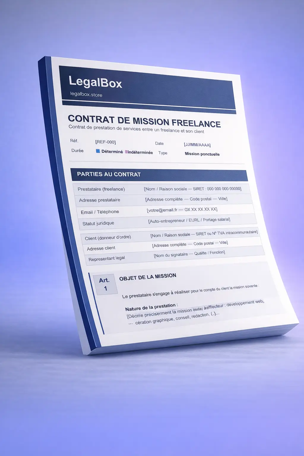 Le Contrat de Mission Freelance est un document contractuel au format PDF remplissable, spécialement conçu pour les travailleurs indépendants qui souhaitent formaliser leurs missions ponctuelles avec leurs clients de façon professionnelle et sécurisée.
